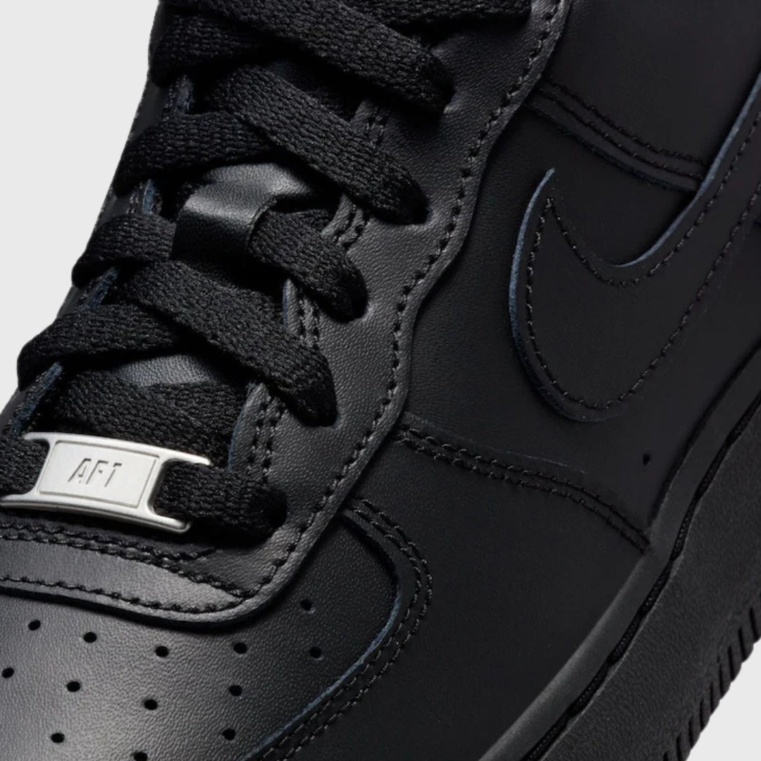 The Nike Air Force 1 Low '07 Black features a triple black smooth leather upper with a matching Air sole and laces. Subtle Nike Air embroidery on the heel tab nods to the history of the AF-1 line. A metallic lace tag and woven tongue label complete the design.